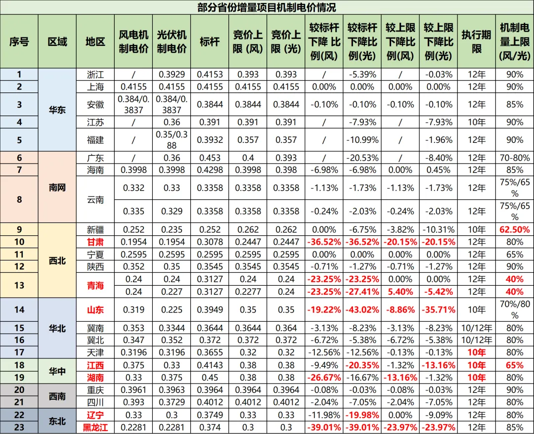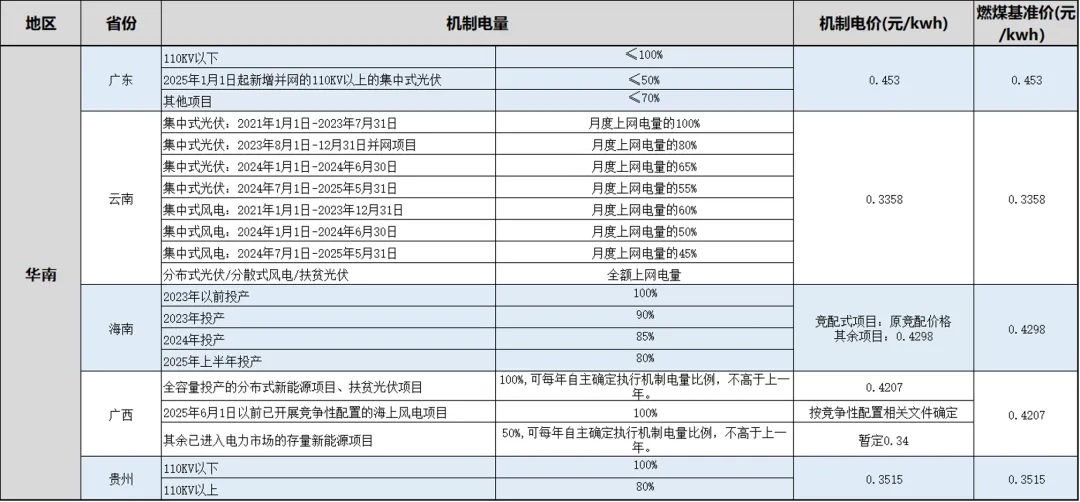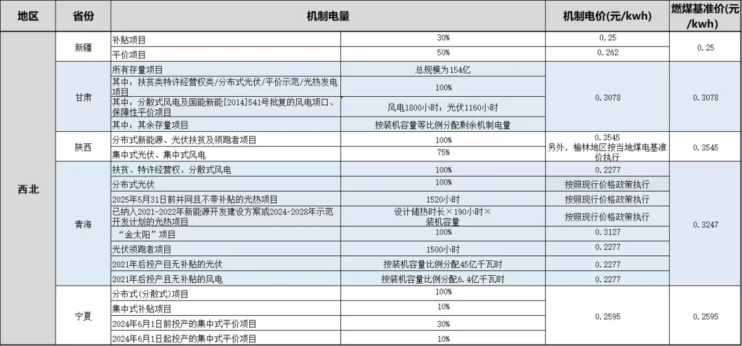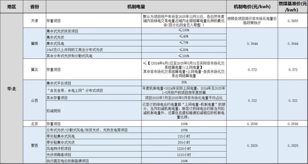 各省存量项目机制电价/量情况