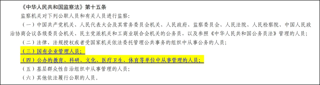 综上,事业单位中监察对象的范围可以简单概括为:承担行政职能的事业单位中参公管理人员和从事公务的人员,及其他事业单位中从事管理的人员。