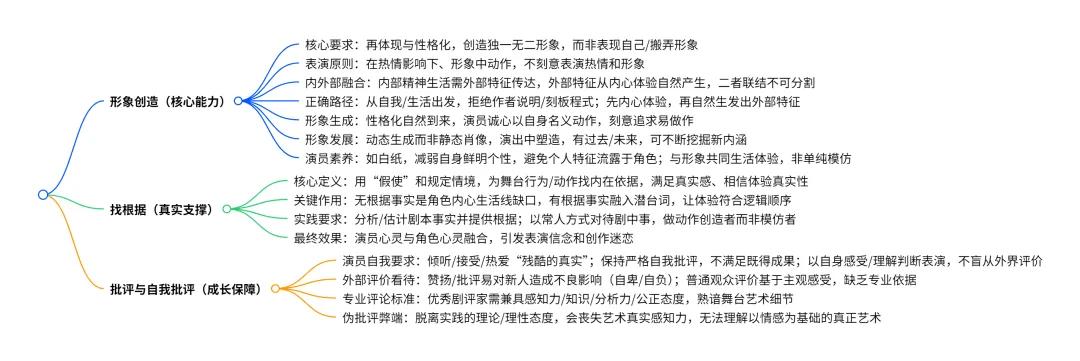 真正的、活生生的性格化是自然而然到来的,连你们自己对这一点都将毫无所知。我们这些从旁观察的人到时候会来讲述,你们同角色融合为一后到底产生了什么。你们自己却要继续随时以自己的名义、诚心诚意地去动作。只要你们一开始想到形象本身,你们就会忍不住去做作和表现了。所以一定要多加小心(《全集》第4卷,415页)