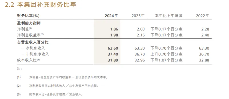 以下是招商银行近10年的数据,可以看见净利差一直在缩小,2014年是2.7%,2024年只有1.86%,这也是银行业日子不如从前那么滋润的重要原因。净利息收入占比也大幅下降,说明招商银行其他业务发展比较快,占比在提高。