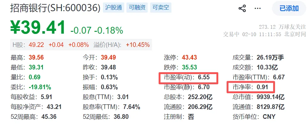 当前招商银行价格39.39元,市盈率TTM6.67,PB0.91,股息率2/39.39=5.08%,招商银行值多少钱? 这个还是需要再仔细想想!