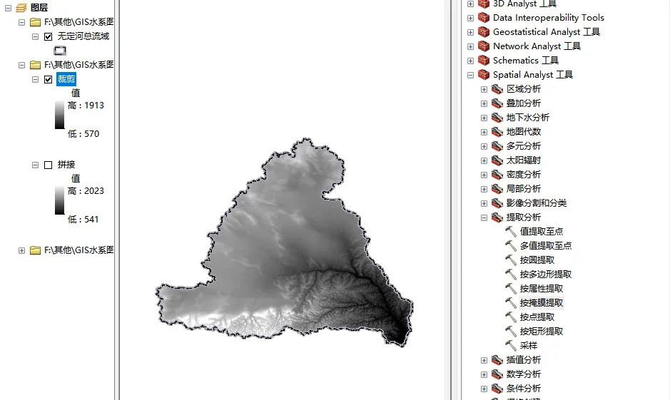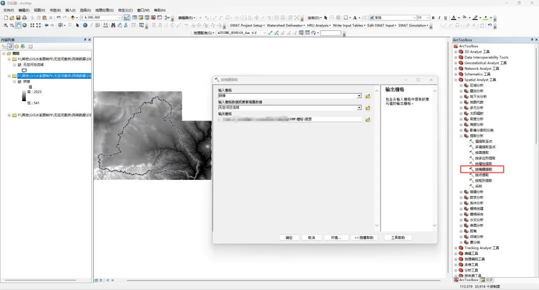 从拼接好的DEM数据中,裁剪出工作所需要的研究范围,本次以无定河流域为例,裁剪出无定河流域的DEM数据。使用工具箱中“Spatial Analyst 工具-提取分析-按掩膜提取”。如图3所示。