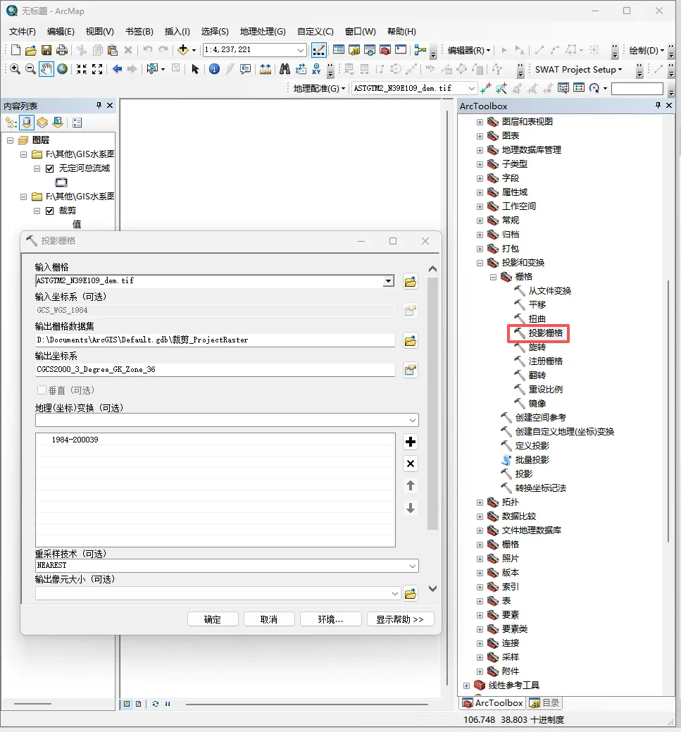 栅格自带的坐标系不符合使用要求,需要变换时,可选择工具箱中“数据管理工具-投影和变换-栅格-投影栅格”,修改为所需的坐标系。如图5所示。
