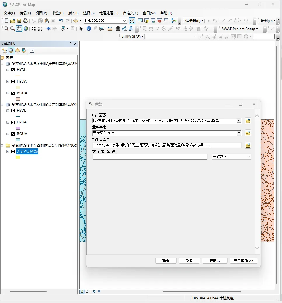 以无定河流域面积为裁剪要素,裁剪出基础数据中流域内的数据,以HYDL(水系线)为例,使用“地图处理-裁剪”进行操作,如图8所示,裁剪结果如图9所示。