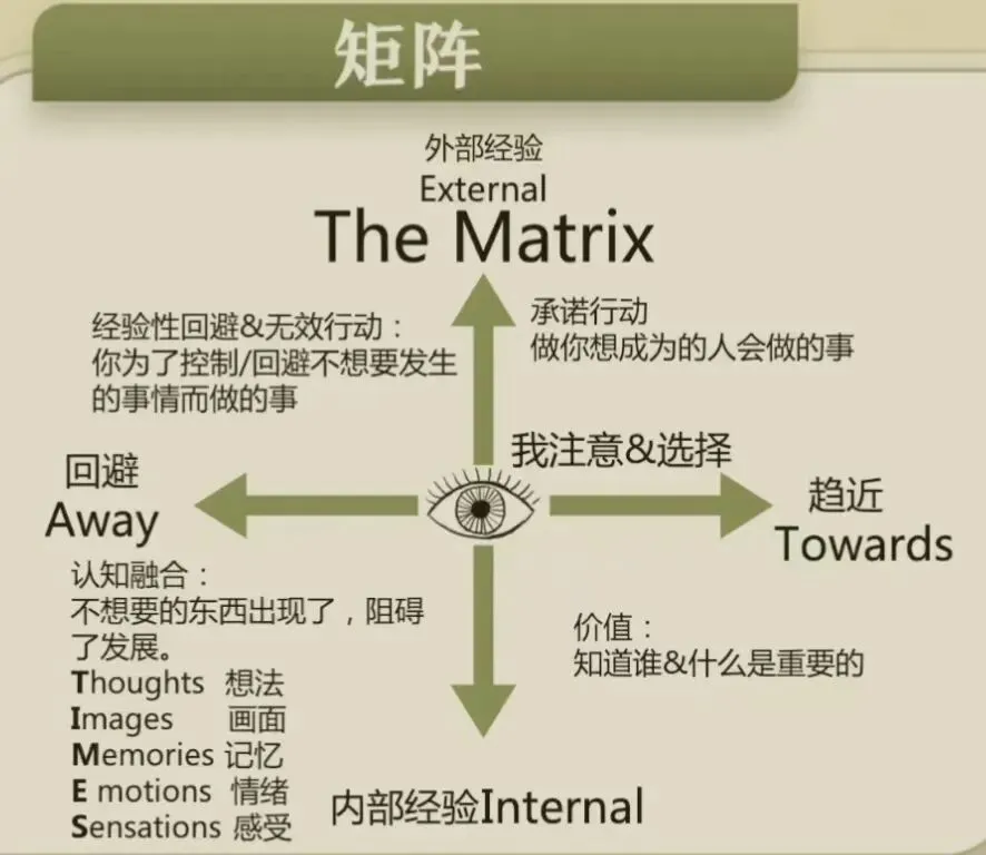 1)目标——了解来访者的问题,他是如何应对的,效果和代价如何,帮助来访看到过去的无效控制策略2)可能用到的练习——泥沼中的人,洞中人等隐喻,澄清控制和回避才是问题3)家庭作业——觉察日记,记录自己是如何应对不良刺激和情绪的1)目标——检验家庭作业过程中控制策略的效果,介绍“控制即问题,而非解决之道”的观念。3)家庭作业——实施制定好的初级行为目标,每日意愿日记1)目标:关注来访者的体验,以加强“控制即问题”的认知,引出另一种选择:体验感受的意愿识别:干净的痛——客观存在的身体情绪反应&污染的苦——对这些反应产生评判而生出的苦。干净的情绪VS污染情绪日记;实施制定好的行为目标;每日意愿日记。2)练习:公家车上的乘客;随溪漂流(正念);正念练习;认知解离1)目标:评估来访从想法和情绪中解离出来的能力,掌握认知解离的一些方法1)目标:介绍价值的重要性,帮助来访看清自己现阶段人生最重要的事情是什么1)目标:帮助来访者识别自己在哪些生活领域没有充分地以价值为导向生活,讨论目标和价值之间的区分2)练习:讨论目标和价值之间的关系;过程和结果的区别:滑雪隐喻;本周以价值为导向的目标行为1)目标:探索目标和行动之间的关系,是来访更自觉自愿地采取一些行动,帮助应对前行过程中遇到的障碍2)可用练习:迈出一小步;路上的小坑隐喻,识别本周要完成的以价值为导向的行动目标1)目标:讨论完成目标过程中可能遇到的问题,或怀疑等消极体验,帮助更熟练使用ACT的方法2)可能的策略:不速之客(流浪汉乔的隐喻);跳跃练习:全有或全无本质3)作业:继续以行为激活为特色,在更长远目标、价值激励下,做出具体行动。1)目标:让来访者成为自己的治疗师;关于结束治疗的议题;为终止治疗后的波折做准备2)可能的策略:为结束做准备;识别困难的fear模式;识别自己的ACT模式3)作业:为自己制定治疗后计划;记录长期的目标行为激活1)目标:反思已取得的进步,未来的可能性(症状反复、受挫等),允许自己有失败(可以自我暴露自己的失败经验)2)可能的策略:两座山的隐喻;可能的追踪回访反馈;治疗后计划启——建立关系,了解他的问题,以及他想达到的目标。承——听他的故事,帮他看到他在其中的应对模式,以及继续重复这些模式带来的无望感,激发改变意愿转——以正念接纳痛苦,看到痛苦的功能和意义,以更广阔更长线的背景看问题,容器变大,问题变小。
