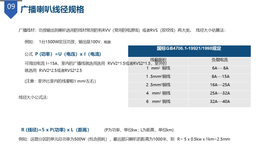 广播线材:功放输出到喇叭选用的线材常用的有RVV(常用的电源线)或者RVS(双绞线)两大类。线径大小估算法: