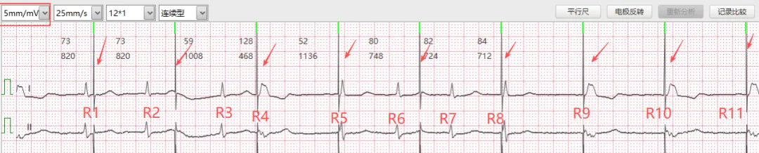 从该图来看,可以很容易看出来起搏器感知功能不良。那起搏功能如何呢?从该图可以看出来,该患者基础心律为房颤,而R9-R11为完全心室起搏波形,推断R4也是完全心室起搏图形;而R5/R8为真性融合波。而其他起搏信号后没有带起心室起搏,是因为均落于前一个QRS波的T波前或上,处于心室不应期故没有起搏心室。由此推断该患者起搏功能尚且良好。