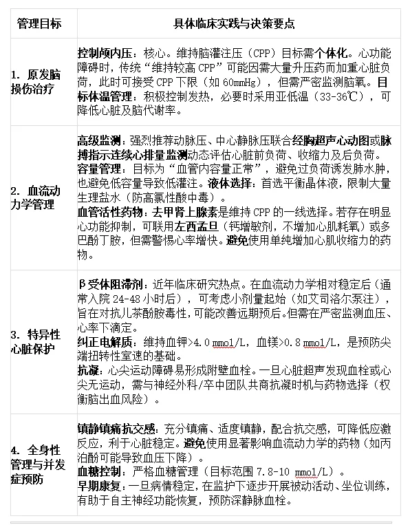 管理核心是在脑保护与心脏支持间取得精细平衡,核心原则是 “脑心共治,平衡优先”。即在支持衰竭心脏的同时,绝不加重原发脑损伤。治疗策略高度个体化,需在神经重症监护室(NICU)内进行多模态监测。