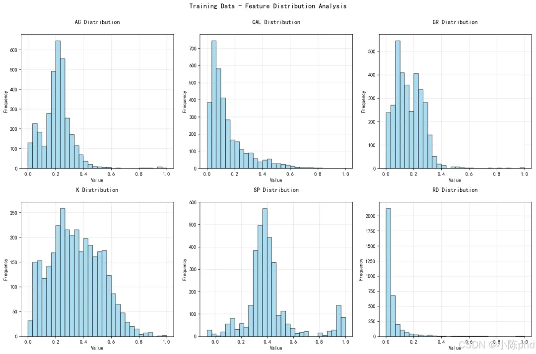 归一化后训练数据基本统计: AC: min=0.0000, max=1.0000, mean=0.2108, std=0.1100 CAL: min=0.0000, max=1.0000, mean=0.1450, std=0.1353 GR: min=0.0000, max=1.0000, mean=0.1663, std=0.1037 K: min=0.0000, max=1.0000, mean=0.3465, std=0.1809 SP: min=-0.0627, max=1.0000, mean=0.4181, std=0.1965 RD: min=0.0000, max=1.0000, mean=0.0492, std=0.0872
