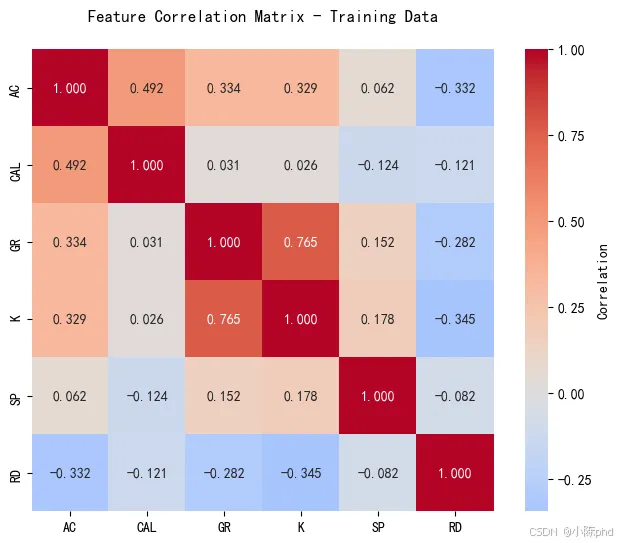 import pandas as pdimport numpy as npimport os# 加载数据current_path = os.path.dirname(os.path.abspath(__file__))training_data = pd.read_csv( os.path.join(current_path, 'data', '3345train_data.csv'), encoding='utf-8-sig', engine='python')testing_data = pd.read_csv( os.path.join(current_path, 'data', '3345test_data.csv'), encoding='utf-8-sig', engine='python')# 特征选择feature_cols = ['AC', 'CAL', 'GR', 'K', 'SP']X_train = training_data[feature_cols].copy()y_train = training_data['RD'].valuesX_test = testing_data[feature_cols].copy()y_test = testing_data['RD'].valuesprint(f"训练集: X_train {X_train.shape}, y_train {y_train.shape}")print(f"测试集: X_test {X_test.shape}, y_test {y_test.shape}")