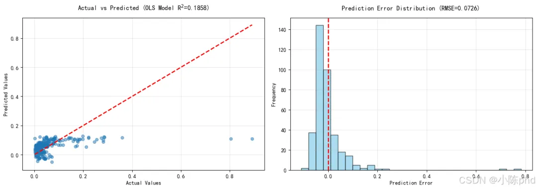 import statsmodels.formula.api as smf# 建立 OLS 模型model = smf.ols( formula='RD ~ AC + CAL + GR + K + SP', data=training_data).fit()# 输出统计摘要print(model.summary())# 预测y_pred_ols = model.predict(exog=testing_data[feature_cols])# 性能评估from sklearn.metrics import r2_score, mean_squared_errorr2 = r2_score(y_test, y_pred_ols)mse = mean_squared_error(y_test, y_pred_ols)rmse = np.sqrt(mse)print(f"R² = {r2:.6f}")print(f"MSE = {mse:.6f}")print(f"RMSE = {rmse:.6f}")
