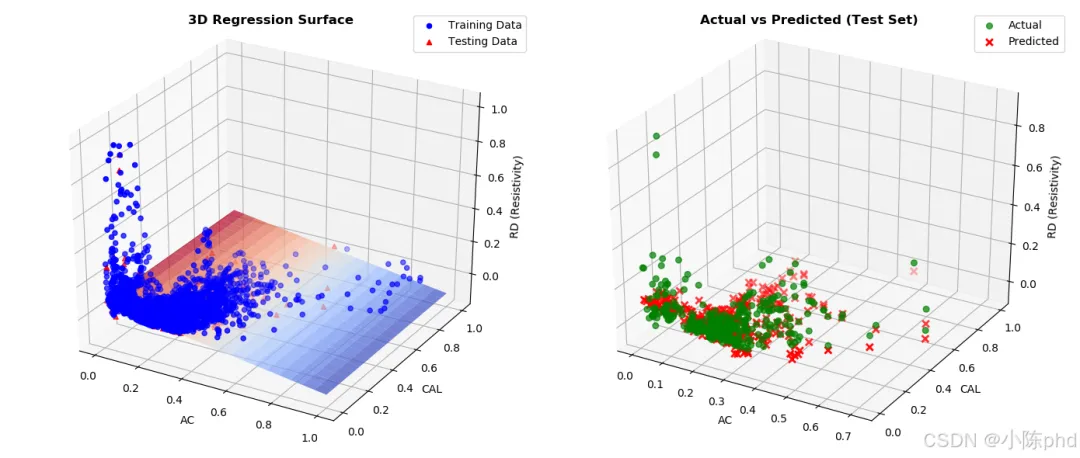 - • 左图:三维电阻率预测曲面 + 训练/测试数据点的空间分布
