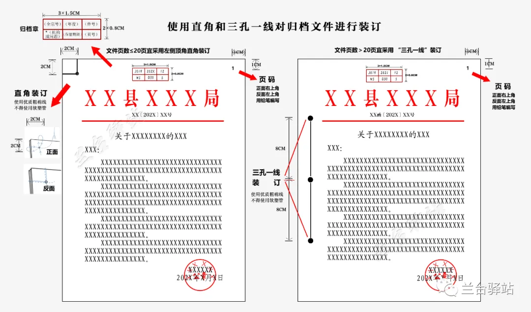 定期保管的、需要向综合档案馆移交的归档文件,装订方式宜选择直角装订或三孔一线装订。定期保管的、不需要向综合档案馆移交的归档文件,装订方式可以选择直角装订或三孔一线装订,也可以使用不锈钢夹或封套装订。