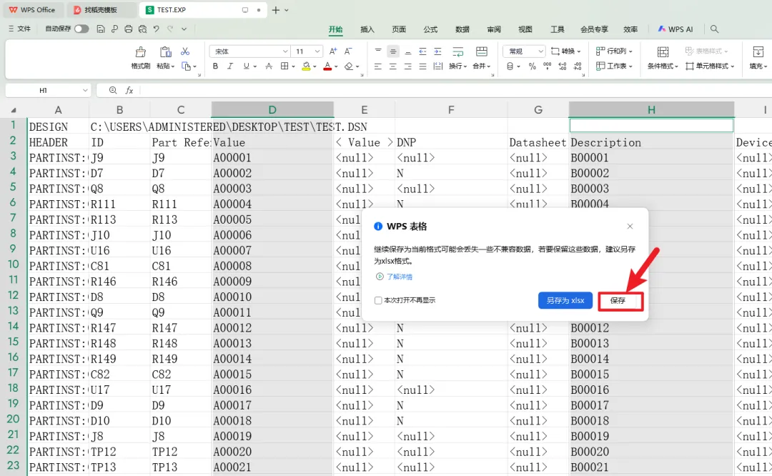 修改完之后点击保存,千万不用另存为xlsx等Excel格式