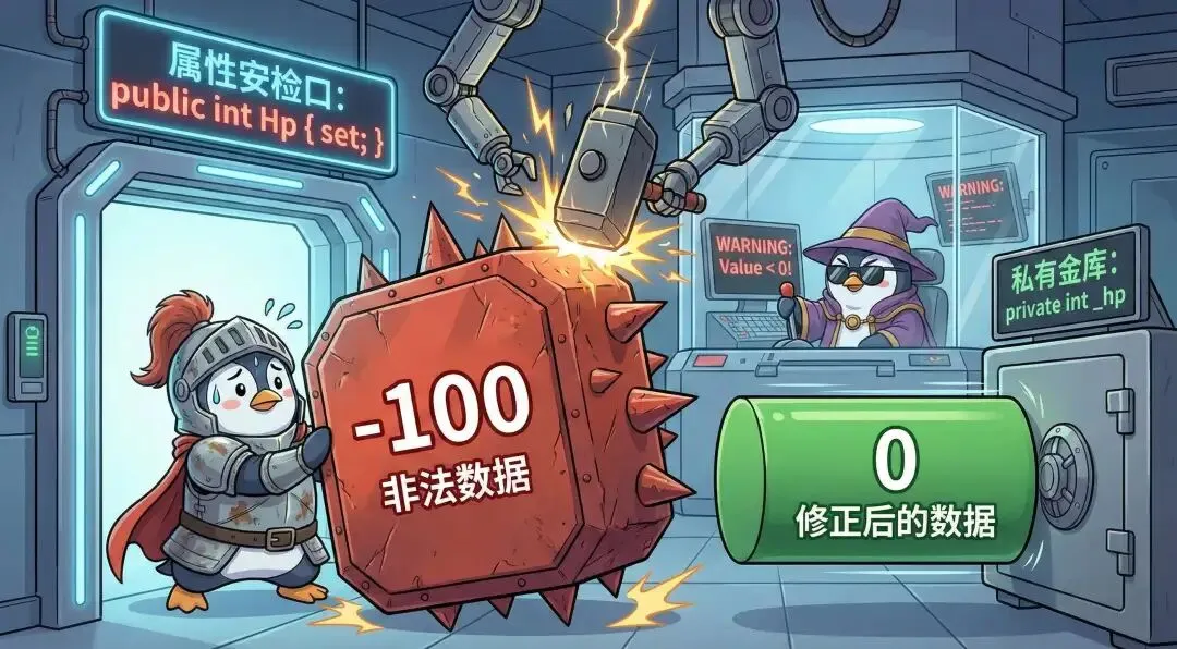 publicclassMonster{// 真正的血量,藏在保险箱里privateint _hp;// 对外开放的窗口publicint Hp {get {return _hp; // 想看?可以 }set {// 👮♂️ 安检开始// value 是 C# 关键字,表示“外面传进来的新值”if (value < 0) { Console.WriteLine("警告:血量不能为负,已修正为 0"); _hp = 0; }elseif (value > 1000) { _hp = 1000; // 锁上限 }else { _hp = value; // 合法,放行 } } }}