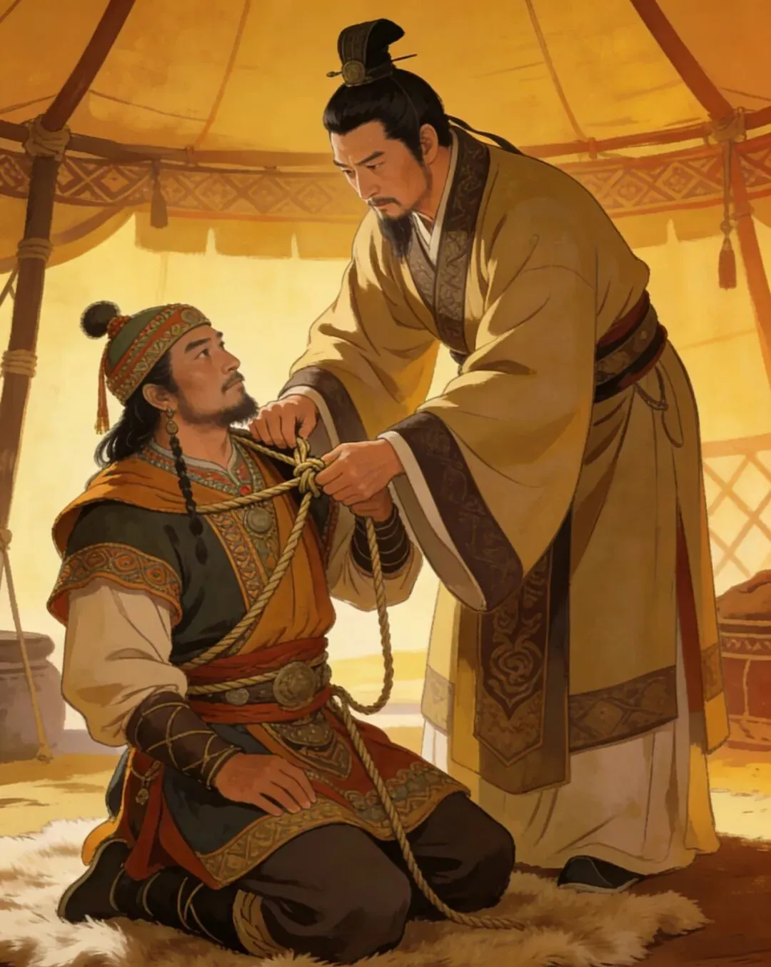 天亮后,班超返回向郭恂说明情况。郭恂听后脸色大变,随即低头沉思。班超明白他的心思,主动拱手道:“郭从事虽未亲身参与,但功劳岂会独归于我?你我本为一体。”郭恂这才转忧为喜。班超随即召见鄯善王广,向他出示匈奴使者的首级。广见状吓得面色惨白。班超趁势宣扬汉朝的威德,告诫他必须断绝与匈奴的往来,否则匈奴使者的下场便是前车之鉴。广慌忙伏地叩首,表示服从,并愿遣送儿子随班超返回,作为人质向窦固表明归附之心。窦固得知后大喜,立即上表奏报班超的功绩,并建议朝廷另派使者继续安抚西域。汉明帝阅后说道:“有班超这般智勇兼备之才,何必再选他人?”于是正式任命班超为军司马,命他继续承担安抚西域的任务。接到诏命后,窦固再次派遣班超出使于阗,并为他增派兵马。班超婉拒道:“于阗路途遥远,多带数百士兵并无大用,反成负担。我只带原来那三十六人,见机行事即可。”说罢,便率众启程西行。