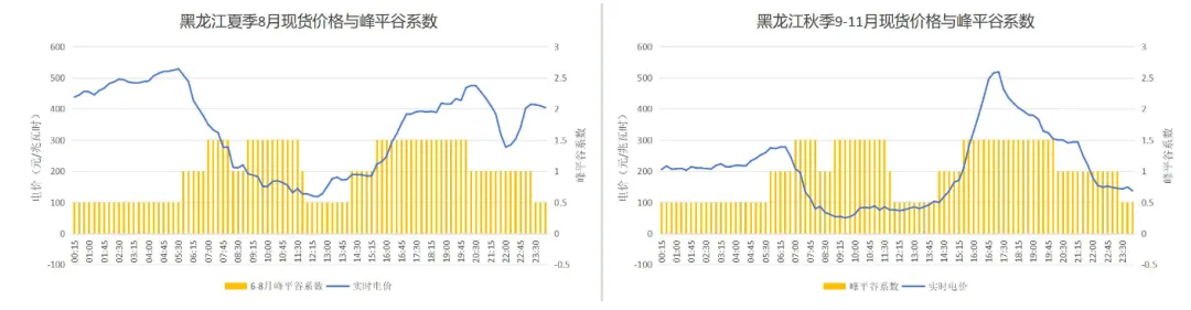 分时价格:夏季8月,早间(08:00-10:00)是工业开工、居民用电小高峰,但此时光伏等可再生能源尚未进入全天出力高峰,供电相对紧张,推高早间电价;而午间光伏满发、供电充足,电价回落。秋季9-11月,晚间(15:00-17:00后)气温下降,居民取暖叠加晚间生活用电需求激增,同时午后光伏出力大幅衰减,供电能力下降,供需缺口集中在晚间,因此形成晚间电价高峰。