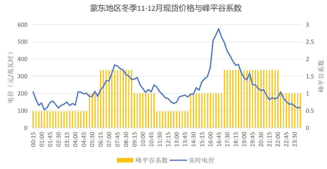 实时价格:从全天96点时段来看,11-12月内,全天最高价格出现在16:45,实时出清价格为574.92元/兆瓦时;最低价格出现在01:15,实时出清价格为103.86元/兆瓦时。