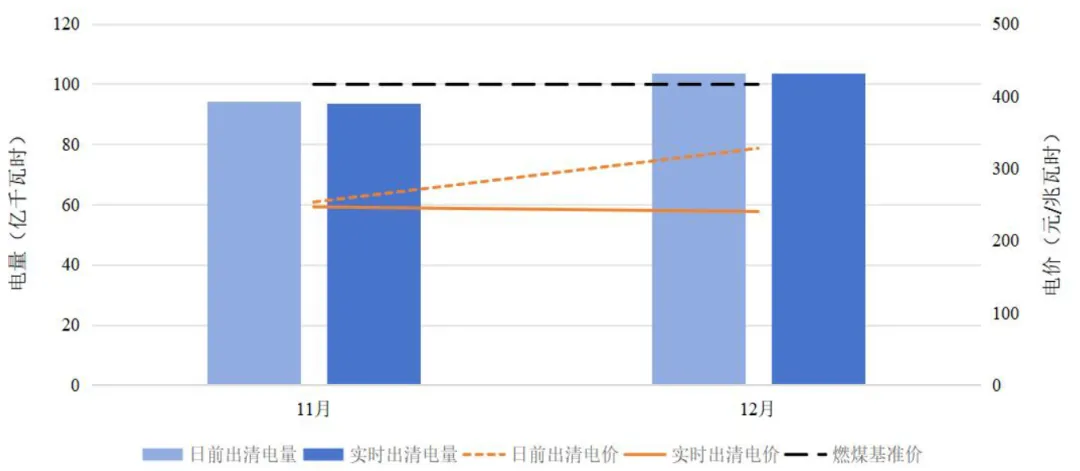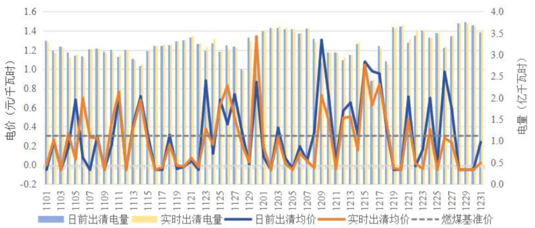 价格触限:11-12月份蒙东地区现货出清均价为237.08元/兆瓦时,触及出清价格上限8.5小时,触及出清价格下限70.25小时。实时出清均价在12月9日达到最高1305元/兆瓦时。