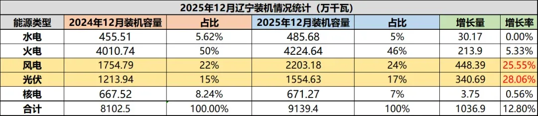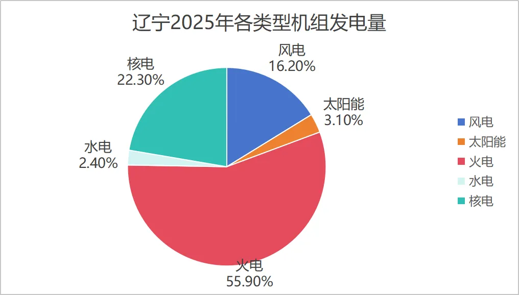 发电量:2025年1-11月,辽宁省全省发电2132.5亿千瓦时,同比增长5.6%。分品种看,火力发电量1192.4亿千瓦时,占比55.9%,同比增长4.6%;水力发电量52.2亿千瓦时,占比2.4%,同比增长32.6%;核能发电量475.5亿千瓦时,占比22.3%,同比增长2%;风力发电量345.8亿千瓦时,占比16.2%,同比增长10.2%;太阳能发电量66.6亿千瓦时,占比3.1%,同比增长9.4%。
