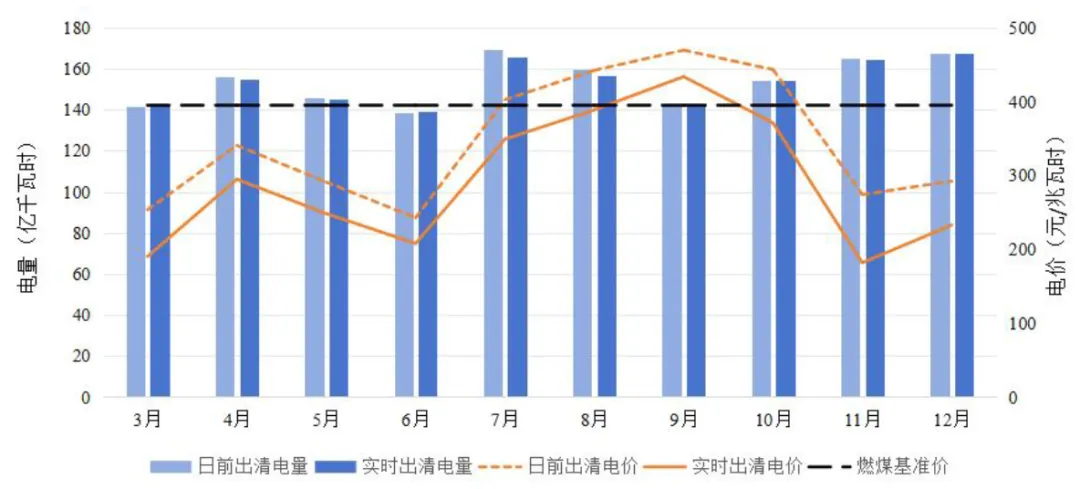 和燃煤基准价对比,全年大部分时段(除7-10月),日前/实时电价均低于燃煤基准价(394.9元/兆瓦时)。