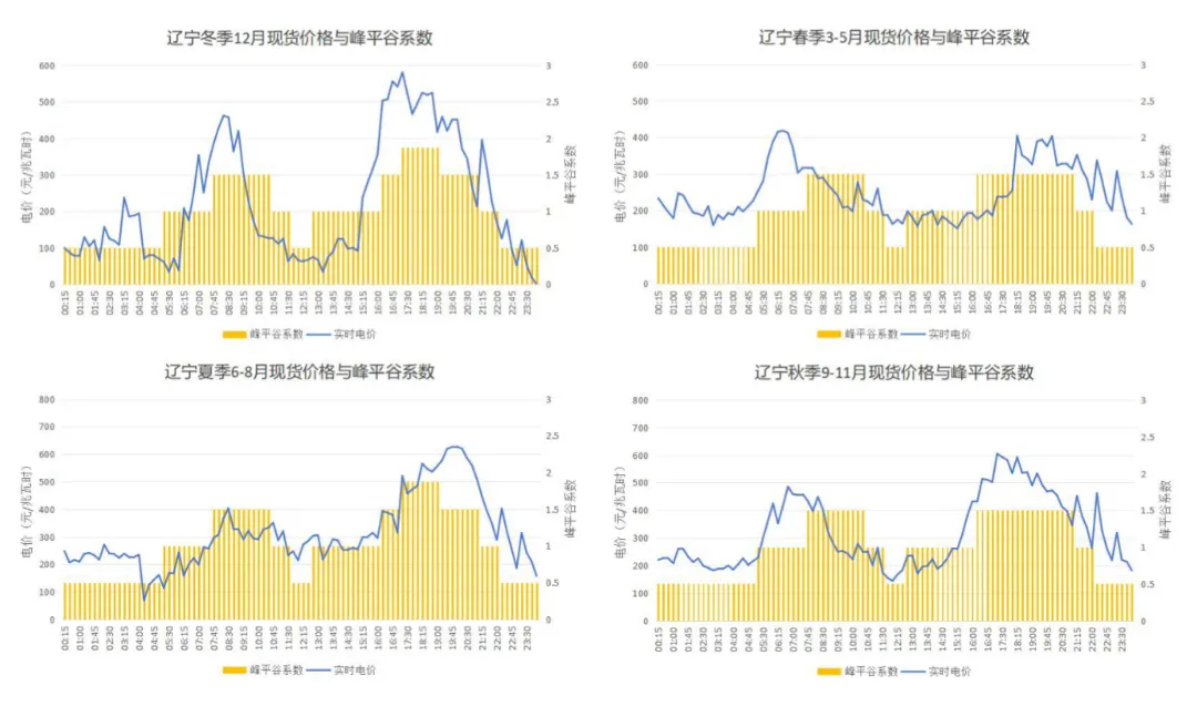 辽宁各季节分时价格与用电侧峰谷时段划分基本吻合,仅春秋季05:30-10:30时段现货价格与峰谷时段划分存在一定偏离。