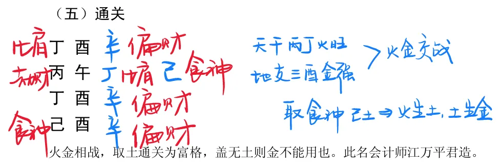 (五)通关:当两种五行对立相克、势均力敌时,需要选取中间五行来调和矛盾。