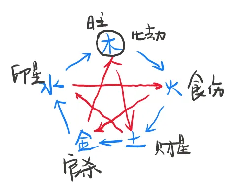 先把十神生克关系附在下图中,方便学习: