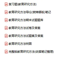 今天分享的资料是「教育研究方法」电子版+学习笔记+知识点总结+期末考试重点+复习资料+习题集及答案+名词解释+历年真题试卷及答案+题库及答案+复习重点+思考题及参考答案+公式总结+考试重点基础题+知识总结+高清PDF可打印+免费分享!