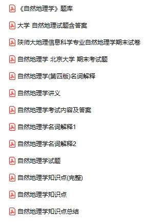 今天分享的资料是「自然地理学」电子版+学习笔记+知识点总结+期末考试重点+复习资料+习题集及答案+名词解释+历年真题试卷及答案+题库及答案+复习重点+思考题及参考答案+公式总结+考试重点基础题+知识总结+高清PDF可打印+免费分享!