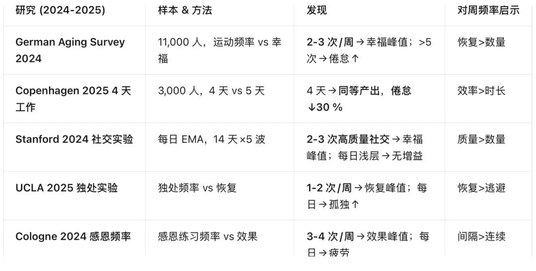 作者提出“周频率优化模型”:幸福、健康与绩效的“甜蜜点”并非每日,而是每周特定频率。