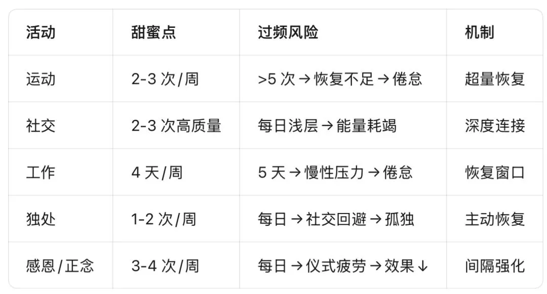 幸福不是“每天做”,而是“每周做对次数”——2-3 次运动、2-3 次深度社交、4 天工作、1-2 次独处、3-4 次感恩,把“疲劳的勤奋”变成“恢复的聪明”。