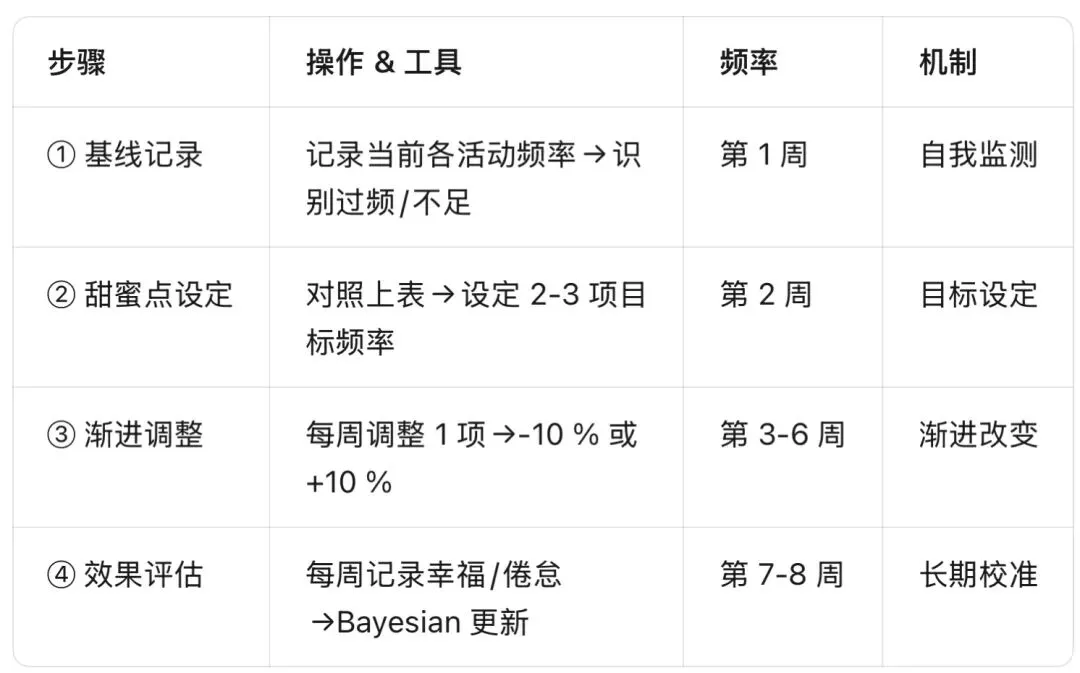 给出 4 步“周频率优化练习”,可在 8 周内将幸福感↑0.42 SD,倦怠↓0.35 SD。