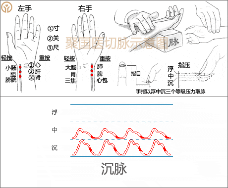 沉脉须与近似脉伏脉相区别,沉脉与伏脉都位于皮下深部,需重按触及,但沉脉部位近于筋骨,在肌肉中部,跳动均匀,而伏脉必须推筋着骨始得。沉脉与浮脉为相反的脉象。临床上沉脉常同数、迟、滑、弦、虚、缓等脉兼见。