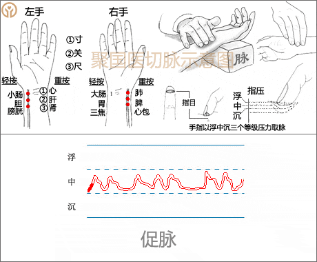 促因火亢,亦由物停。左寸见促,心火炎炎;右寸见促,肺鸣咯咯。促见左关,血滞为殃;促居右关,脾宫食滞。左尺逢之,遗滑堪忧;右尺逢之,灼热为灾。