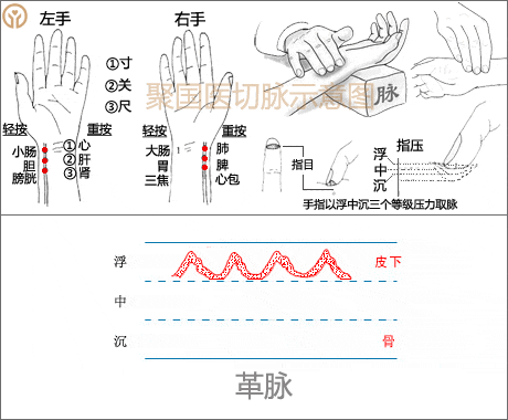 革主表寒,亦属中虚。左寸之革,心血虚痛;右寸之革,金衰气壅。左关遇之,疝瘕为祟;右关遇之,土虚为疼。左尺诊革,精空可必;右尺诊革,殒命为忧。女人得之,半产漏下。