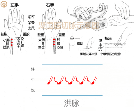 洪脉与实脉相类似,脉象都是强盛有力。脉象的差别在于: