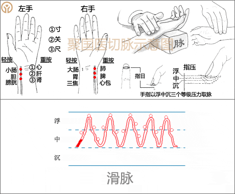 滑脉为阳,多主痰涎。寸滑咳嗽。胸满吐逆;关滑胃热,壅气伤食;尺滑病淋,或为痢积,男子溺血,妇人经郁。