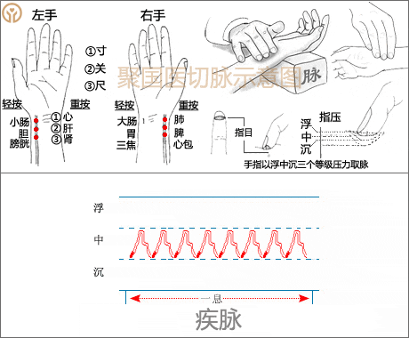 疾为阳极,阴气欲竭;脉号离经,虚魂将绝;渐进渐疾,且多殒灭。左寸居疾,勿戢自焚;右寸居疾,金被火乘。左关疾也,肝阴已绝;右关疾也,脾阴消竭。左尺疾兮,涸辙难濡;右尺疾兮。赫曦过极。