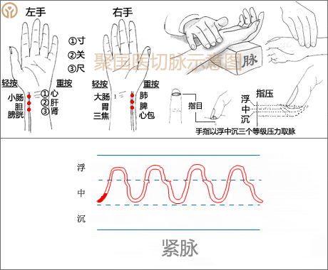 紧主寒邪,又主诸痛。左寸逢紧,心满急痛;右寸逢紧,伤寒喘嗽。左关人迎,浮紧伤寒;右关气口,沉紧伤食。左尺见之,脐下痛极;右尺见之,奔豚疝疾。