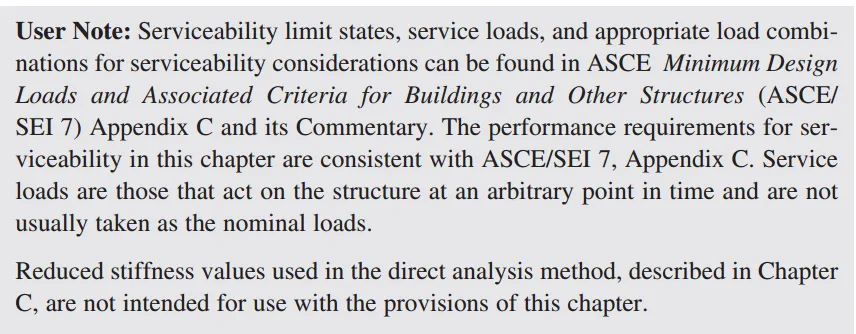 AISC 360-L章指明了我们要去ASCE 7附录查看荷载组合系数,APPENDIX CC-SERVICEABILITY CONSIDERATIONS。