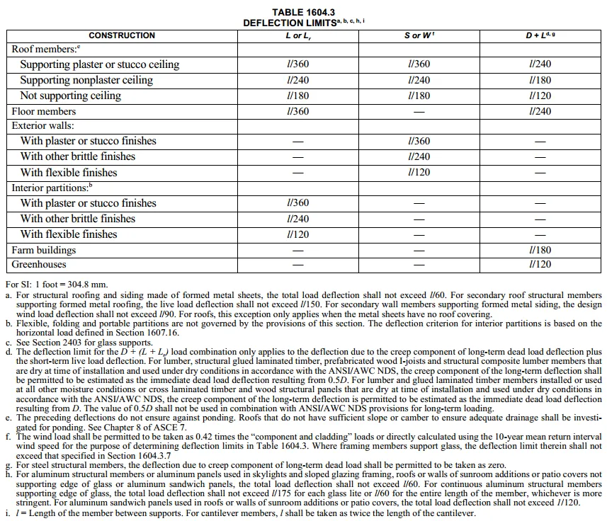 垂直挠度的允许使用限制取决于不同的结构类型、节点设计和使用用途。当挠度超过L/300,人眼可以察觉,会引起可见挠度,所以,对于满载活载的即使用短期组合的钢结构,ASCE7中挠度限制只有文字说明,但是IBC中有简洁明了的图表(上图为IBC 2021TABLE 1604.3),我来整理和翻译一下钢结构的相关构件的竖向挠度限制: