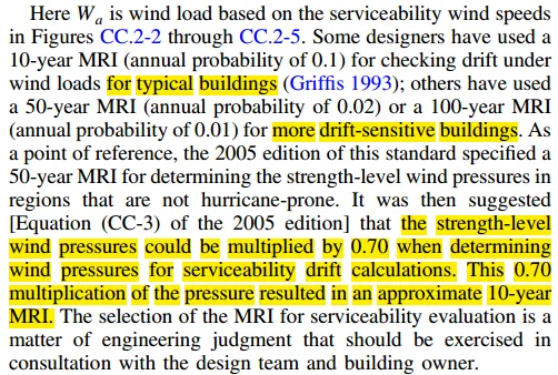 用于计算位移比的荷载组合D+0.5L+Wa,Wa是用于计算serviceability limit state的风荷载,CC章给出了风速地图,对应不同的重现期,正文也给出建议,常规建筑(普通的厂房、仓库等),使用10年重现期风压,对于风荷载敏感性建筑(超高层、有精密仪器?),使用50年重现期风压(或者需要100年及以上重现期)。
