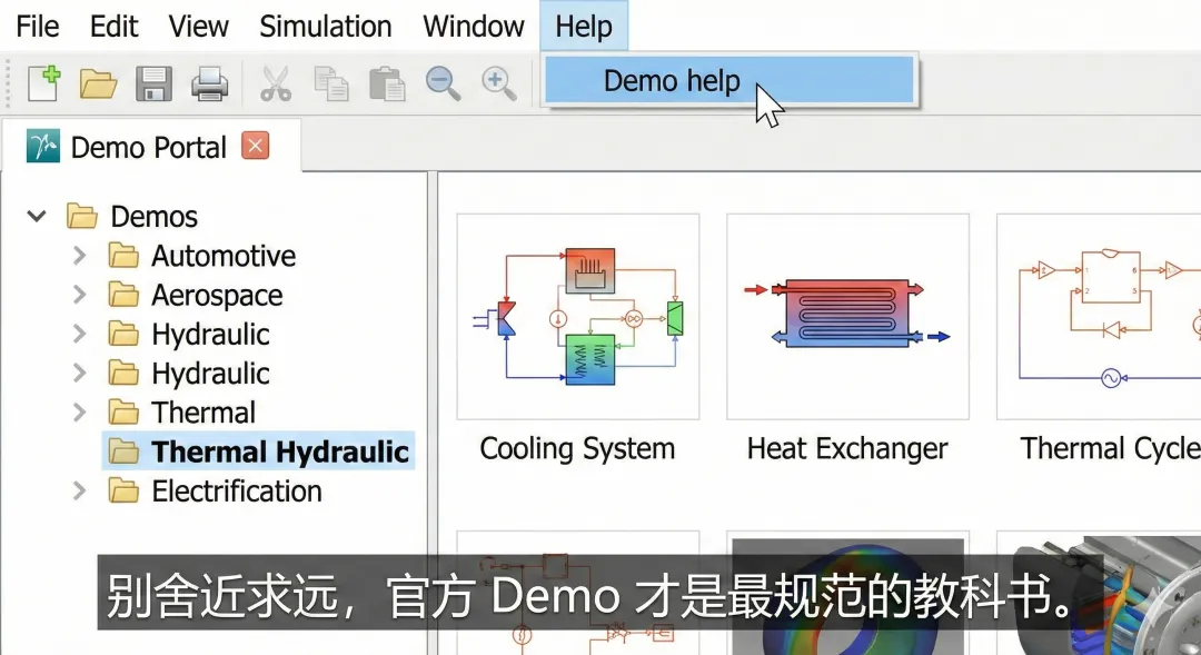 很多新手上来就满世界找教程视频,其实 Amesim 最好的老师就在软件里。Amesim 安装自带了海量的Demo(官方案例),覆盖了液压、热、汽车、航空航天等各个领域。点击菜单栏的【帮助 (Help)】->【演示帮助 (Demo help)】。在左侧目录树里,找到和你专业相关的分类。比如搞热控的,就看 Thermal 或 Thermal Hydraulic。直接把案例双击打开!这是一个可以直接运行的活模型,不是死图片。小编的建议:不要试图看懂所有案例。挑一个最简单的(比如“水箱充水”或“简单液压回路”),先点运行,看曲线。然后尝试删掉一个元件,自己再把它加回去,重新连线。如果能跑通,你就入门了。