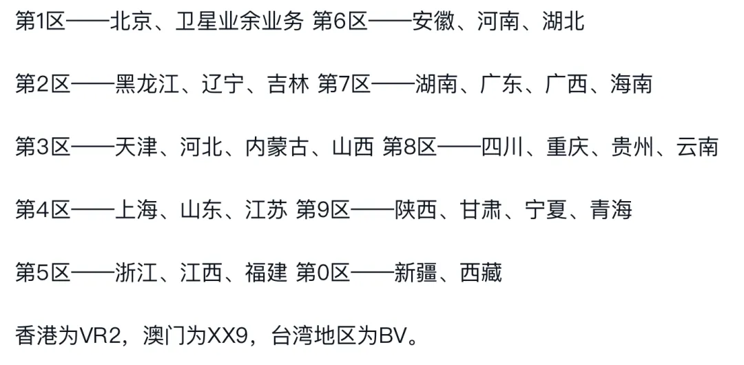 在分区上,我国境内除港澳台地区外的业余电台分区共分为0~9,10个分区。且每一个业余电台呼号都是唯一的,只代表一个特定的电台。
