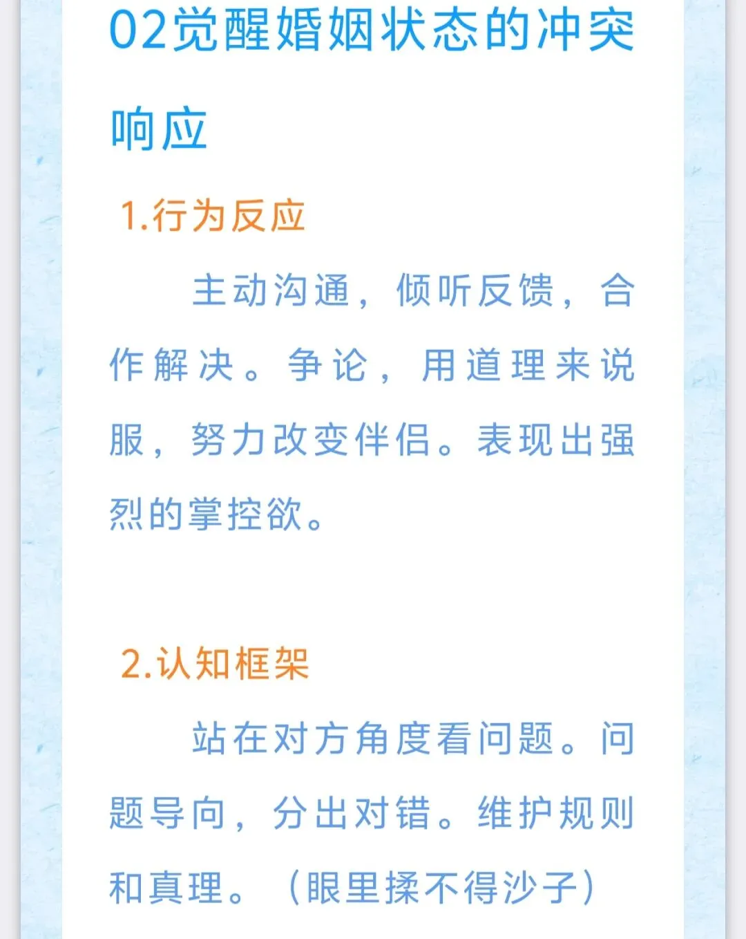大家好,我是Jenlyn。我正在学习《婚因有道》初级课程。我期待成为一名有专业,有能力,有温度的婚姻家庭咨询师。希望将来我能用专业服务社会,用所学帮助更多的人改善婚姻质量,实现幸福生活。同时也希望自己能够成为家庭的守望者,成为他人的祝福。这是我的第十篇学习笔记,分享给大家,希望对您有帮助或启发。