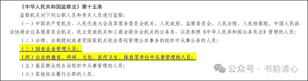 综上,事业单位中监察对象的范围可以简单概括为:承担行政职能的事业单位中参公管理人员和从事公务的人员,及其他事业单位中从事管理的人员。