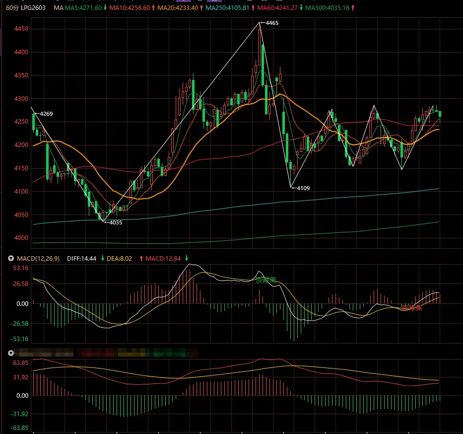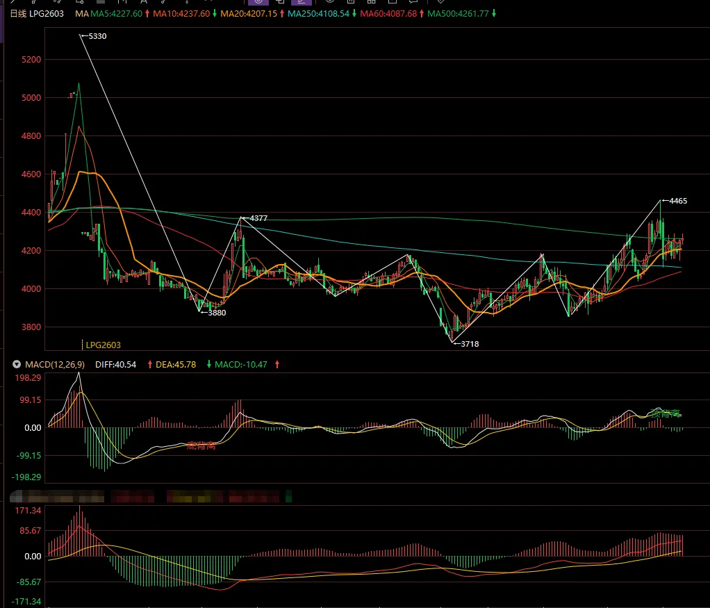 以上是液化气2603周线图,图中下面一个MACD 是月线级别的,图中显示月线MACD已经水下金叉,周线MACD上零轴目前快慢线在红柱中,周线的MACD的红柱暂时没有缩短的迹象。月线和周线MACD多头共振上涨,周线MACD上零轴日线MACD零轴上死叉不会下零轴,会在零轴上金叉死叉2-3次K线不停的出新高,快慢线慢慢靠近零轴的顶背离才有效,此时周线的MACD的表现是快慢线出红柱块钱向下拐头,红柱缩短到最小即将死叉。