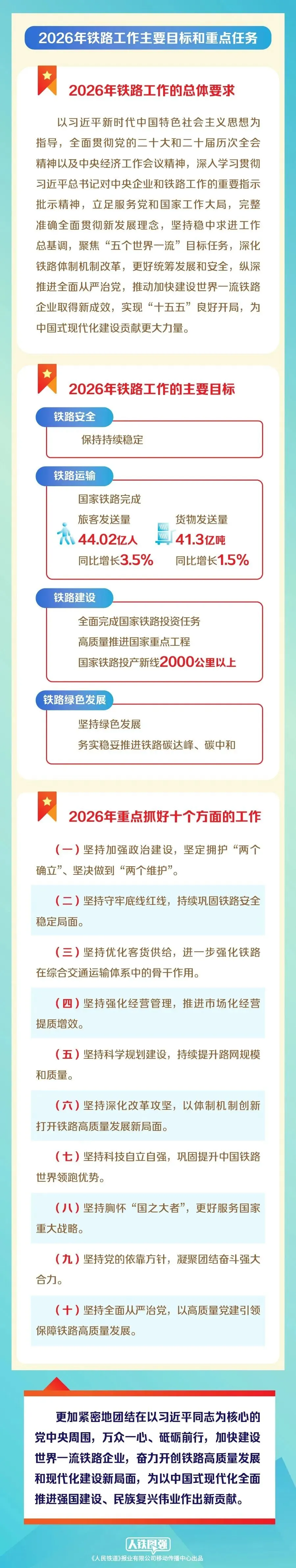 着力提升服务保障水平。2026年春节是个“大年”,返乡探亲旅游出行需求更加旺盛。据预测,今年春运铁路预计发送旅客 5.39 亿人次,加之冬季电煤保供、国际班列开行等货运刚需,可以说铁路人的任务十分艰巨。越是困难,越是彰显担当作为。让我们团结一心,坚决服从调度指挥,立足岗位尽职尽责。特别是广大党员应当响应号召,发挥先锋本色,让党旗在春运一线高高飘扬。同时,大家在工作生活中难免有困难不便,可以向单位求助求援,我们的各级组织始终是职工的坚强后盾。