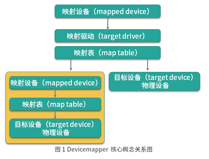 Devicemapper 三个核心概念之间的关系如图 1,映射设备通过映射表关联到具体的物理目标设备。事实上,映射设备不仅可以通过映射表关联到物理目标设备,也可以关联到虚拟目标设备,然后虚拟目标设备再通过映射表关联到物理目标设备。